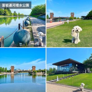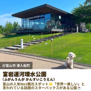 公園内には運河が流れ、天気が良い日は立山連峰を眺めることもできます。そして世界一美しいと有名なスターバックスもあり、テラス席はわんちゃん連れのお客さんの憩いの場になっています🐶