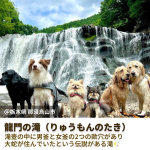 滝を見ながらカフェを楽しむことができるテラス席わんこOKの龍門カフェがある☕
