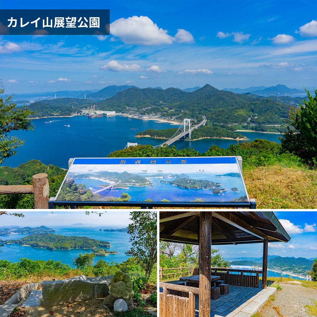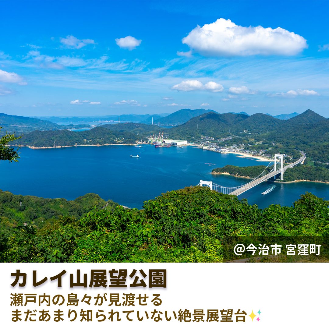 標高232mのカレイ山山頂にある展望台からは、伯方・大島大橋をはじめ能島城跡や瀬戸内海の潮流など、瀬戸内の島々を眺望することができる✨特に、国指定史跡の能島の周りを渦巻く激しい潮流は世界的にも稀で、見る人を感動させてくれる✨