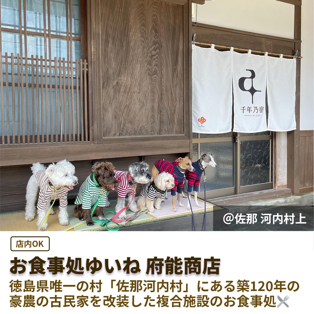 「千年乃宿 旧高木邸」は古民家一棟貸切りで宿泊でき、愛犬も一緒に宿泊OK🐶併設の「お食事処 ゆいね」「府能商店」で佐那河内村ならではのランチや、特別なお土産にも出会える✨